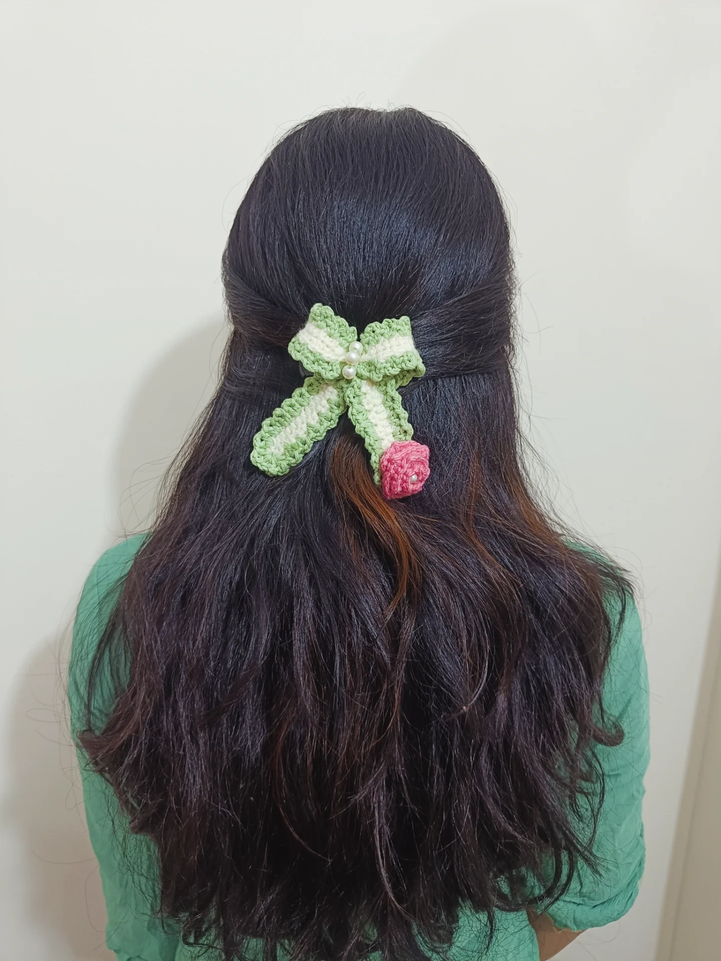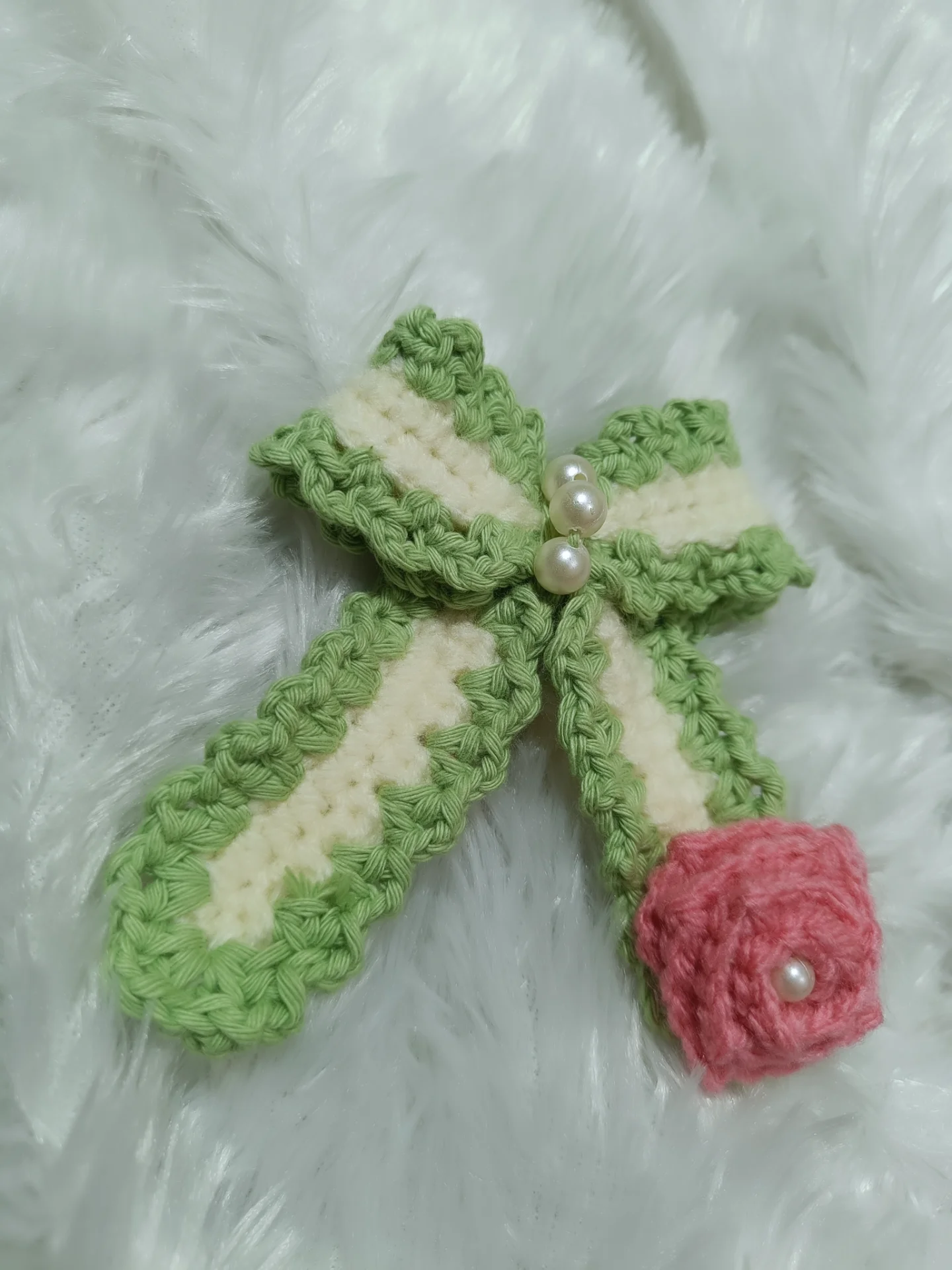 Intricate Detailing: Features a beautifully textured 3D crochet rosette in dusty pink, adding depth and a romantic floral touch to the design.